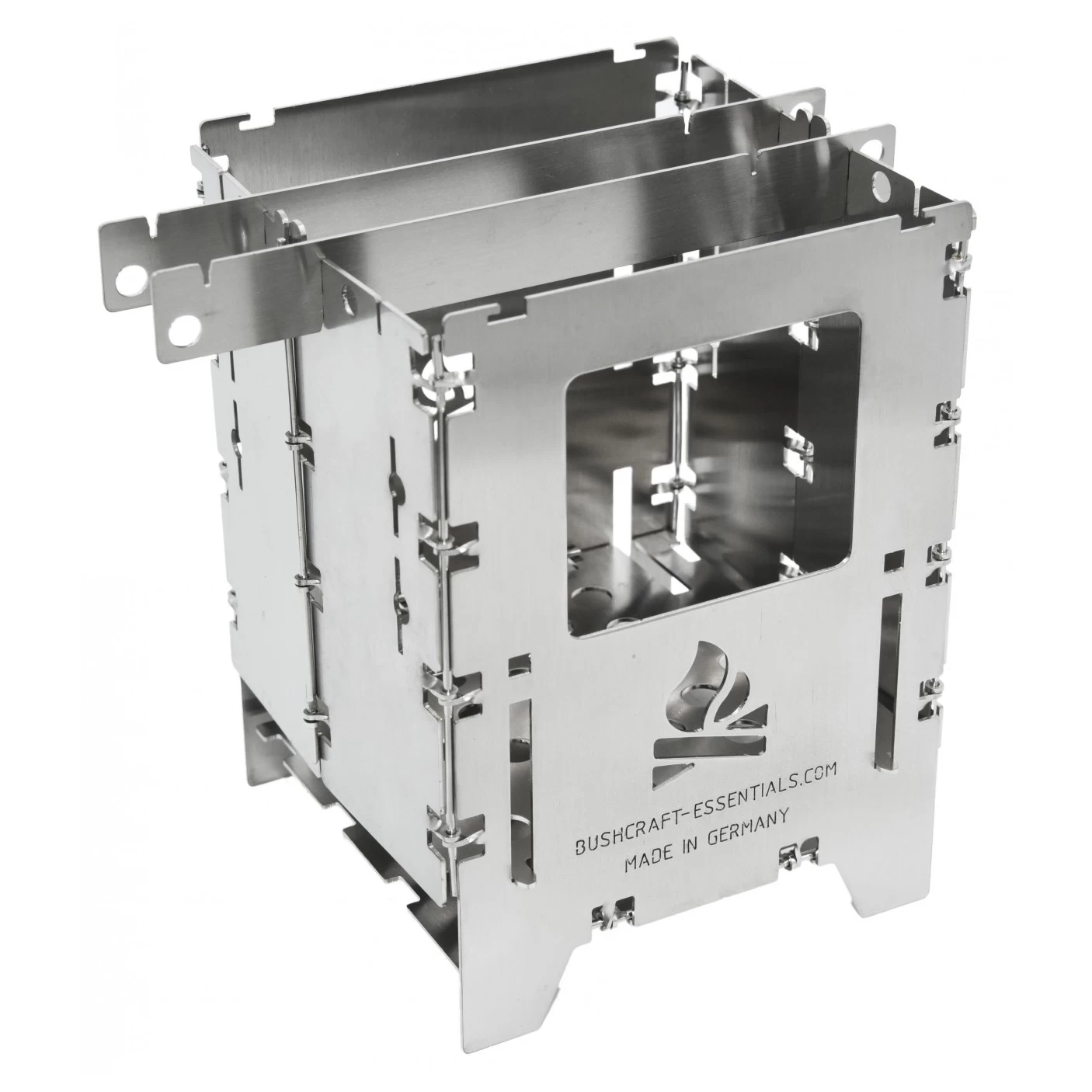 Die Bushbox kann mit den unterschiedlichsten Brennstoffen befeuert werden. Ob Holz, Pellets, Kohle, Spiritus oder Brennpaste – die Bushbox ist durch den Kamineffekt besonders effektiv im Verbrennen. Die mitgelieferten Topfauflagen lassen sich auch als Tragegriffe zum Umstellen der Bushbox nutzen. Ob man nun einen großen oder kleinen Topf zur Hand hat, die Auflagen lassen sich unterschiedlich breit einstecken, damit man jeden Topf darauf stellen kann.